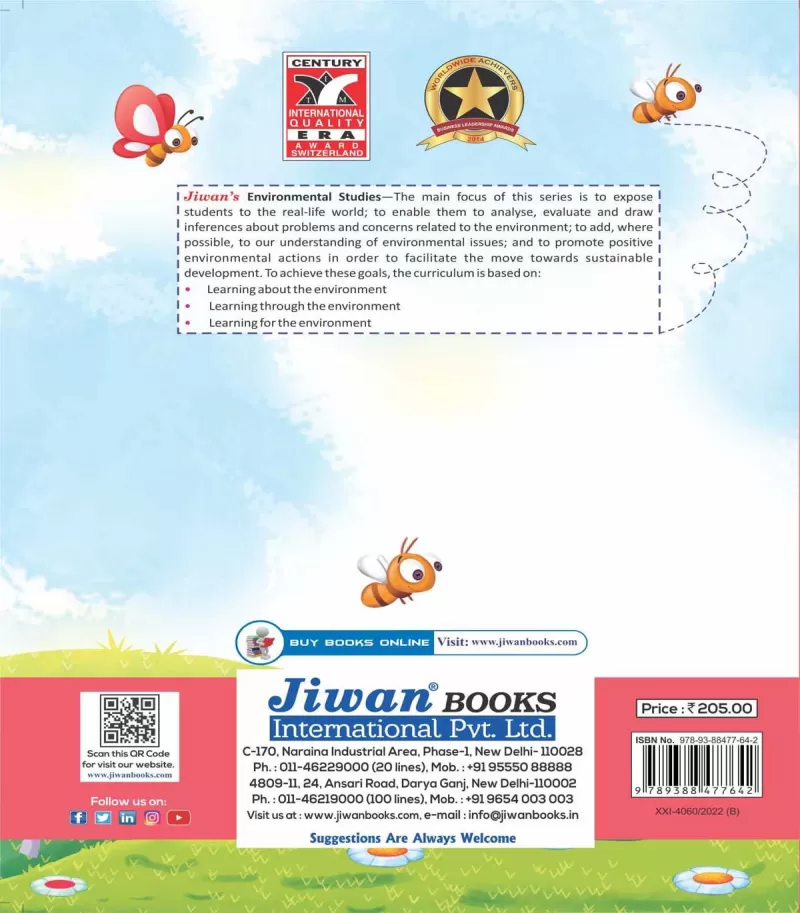 Jiwan’s Environmental Studies is a series for classes Intro to 5. The main focus of the series is to expose students to the real-life world; to enable them to analyse, evaluate and draw inferences about problems and concerns related to the environment ; to add, where possible, to our understanding of environmental issues ; and to promote positive environmental actions in order to facilitate the move towards sustainable development. The series works in compliance with the prescribed NEP 2020 guidelines.It is an activity-oriented series with creatively designed exercises to enable the child to develop 21st century skills and stimulate the mental ability of the students.