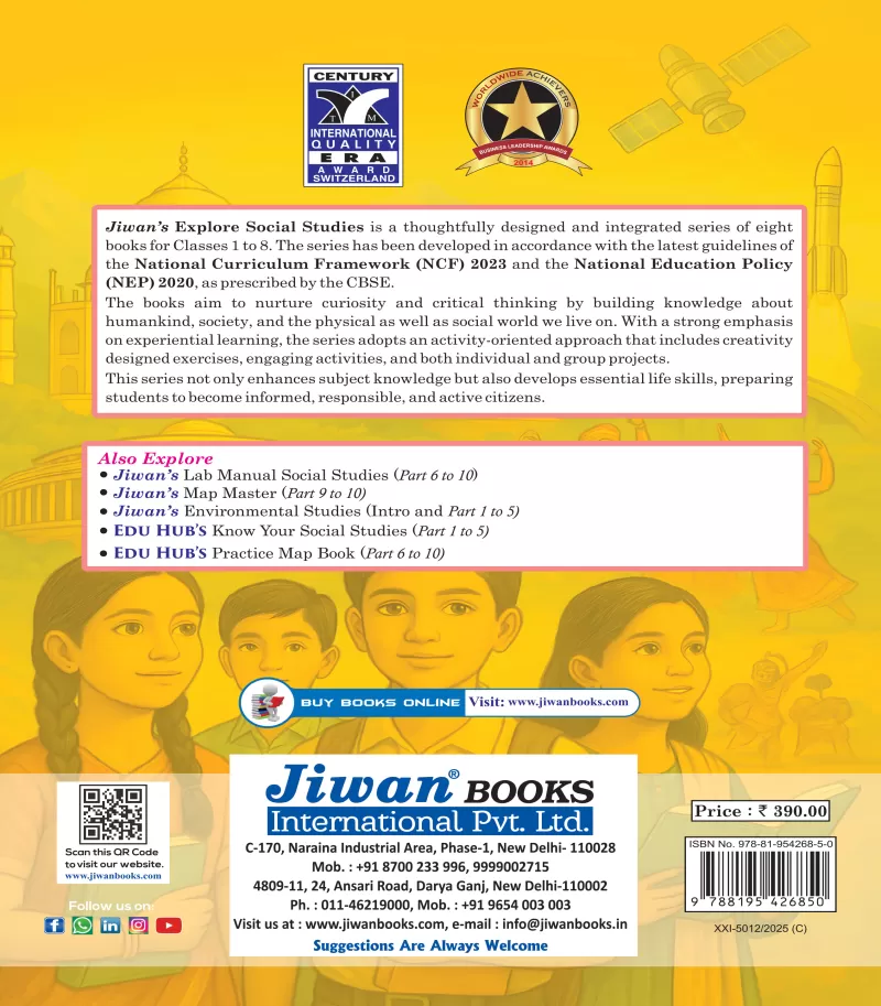 Jiwan's Explore Social Studies is an integrated series of eight books for classes 1 to 8, designed and developed keeping in mind the latest guidelines on NEP 2020 framed by the CBSE.